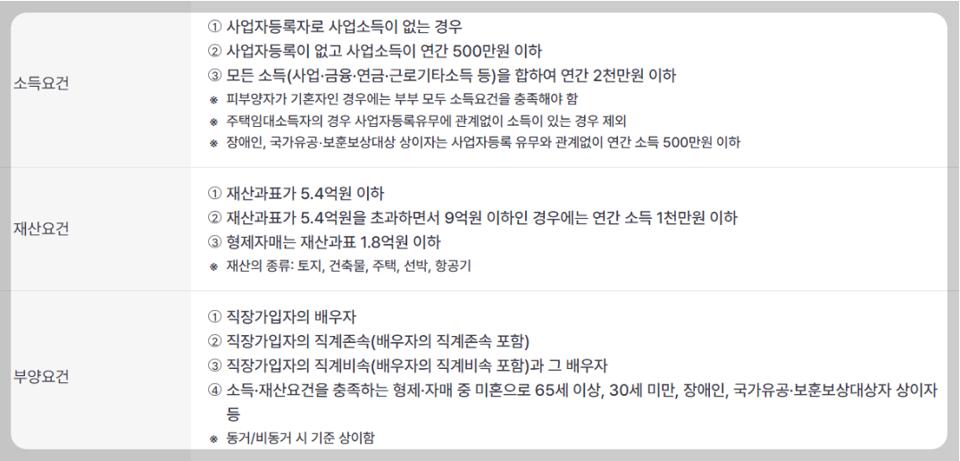 - 부양요건에 충족하는 자 : 피부양자 인정기준 중 부양요건 참조 [「국민건강보험법 시행규칙」 별