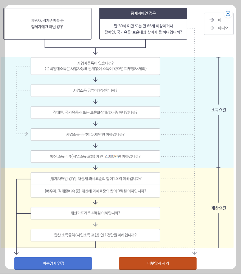 - 형제·자매의 경우에는 재산과세표준의 합이 1.8억 원 이하이어야 함. (단, 만 65세 이상, 만 30세