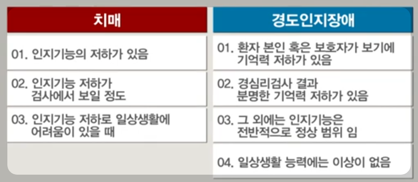 ⦁ 건망증이나 정상적인 노화도 당연히 다르고 약간 기억력이 떨어지는 경도인지장애와 치매의 경계