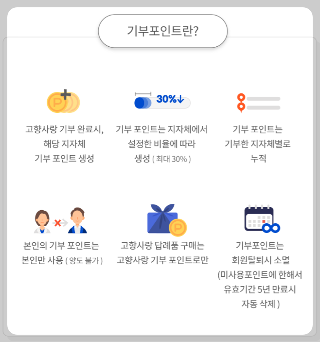 - 기부포인트제는 고향사랑 기부 완료 시 지자체 설정된 비율에 따라 생성되어 적립된 포인트로 상