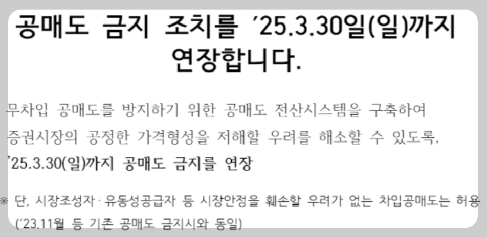 - 2024년 6월 30일까지로 예정되어 있었던 공매도 전면 금지가 2025년 3월 30(일)까지 연장됩니다.