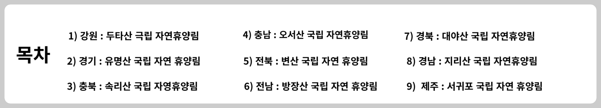 - 안전하게 휴식을 취할 수 있는 전국 각 지역에 소재하고 있는 유명 국립 자연휴양림을 소개하오