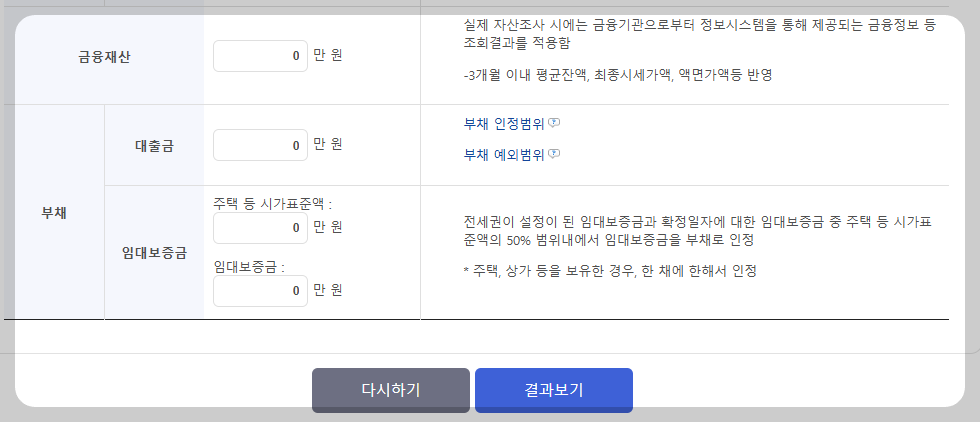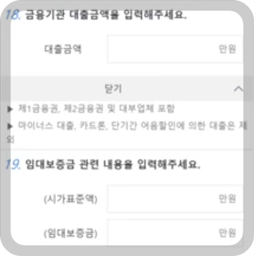 이 있는 경우 임대차 계약서상 임차보증금을 입력하고, 주거목적인 경우 체크를 합니다.