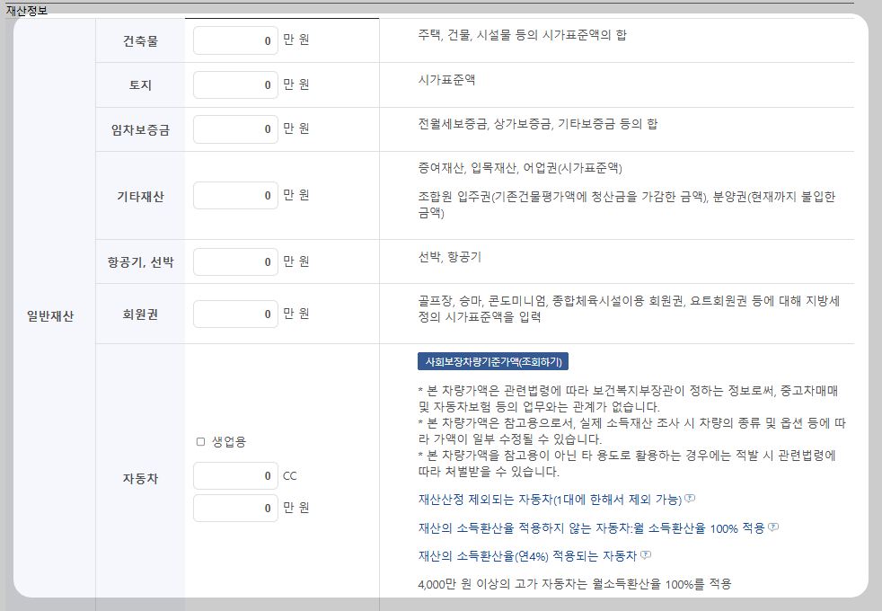 ⑩ 금융재산, 건축물의 시가표준액, 토지의 시가표준액을 입력해 준다.