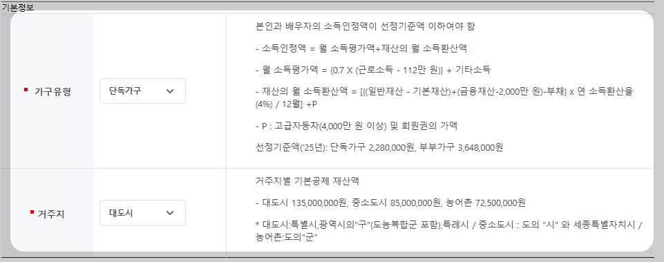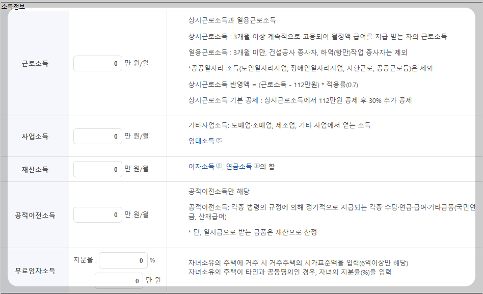 ⑥ 위 화면에서 소득입력 시 월 소득을 입력하고, 부부가구의 경우에는 배우자의 소득과 재산도 기