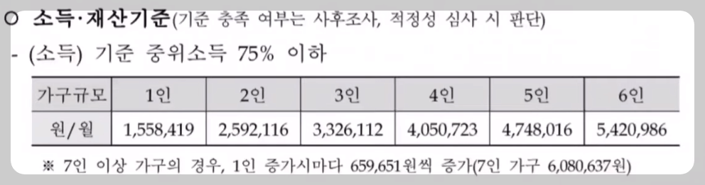 ● (소득) 기준 중위소득 75% 이하에 해당하여야 한다. 아래표참조.