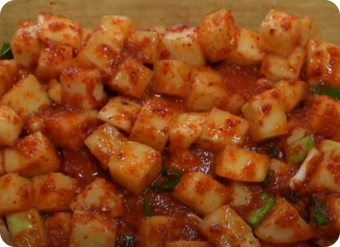 ✱ 섞박지 : 무, 설탕, 천일염, 쪽파, 양파, 마늘, 고춧가루, 새우젓, 멸치액젓, 찹쌀풀. 생강 등 재료입