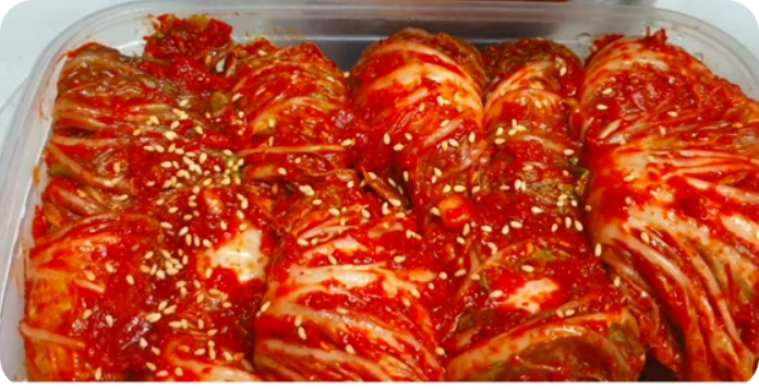 - 절인 배추 겹겹이 에다 양념 속을 넣어 담그는 김치.