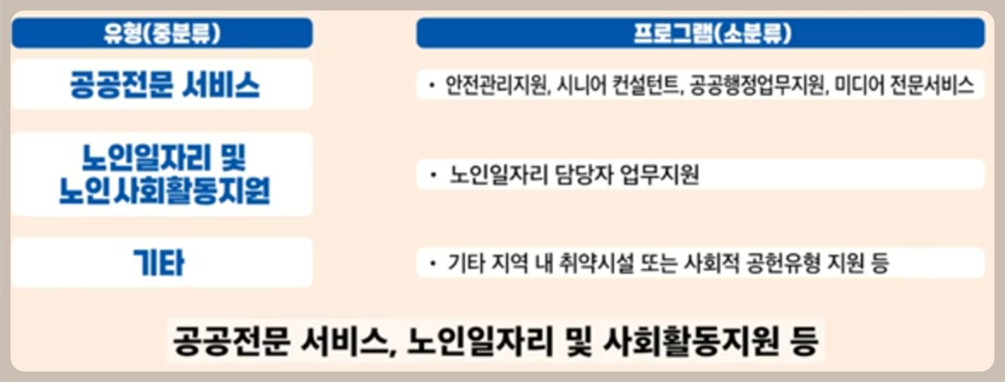 | 일자리 종류 | 노노케어 : 취약노인 생활 지원 활동 취약계층 지원 : 소외계층 지원 활동 공공시설 봉사 : 지역사회 공익서비스 제공 활동 경륜전수 활동 : 노인의 겨험, 지식나눔 활동 |