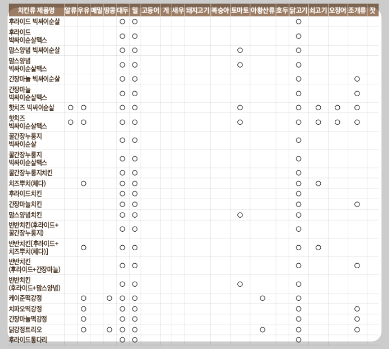 ⦁ 치킨은 바삭한 튀김옷과 촉촉한 속살이 특징인 치킨 메뉴가 대표적입니다. 후라이드와 양념치킨