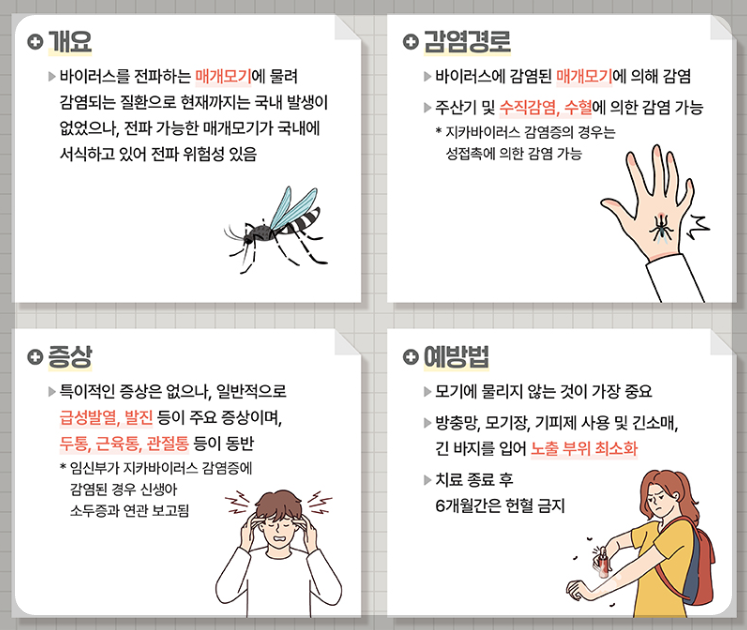 - 불가피한 야간 외출 시 밝은 색 긴 옷 착용, 기피제 사용등 모기에 물리지 않도록 개인 예방을 철저히 실천.