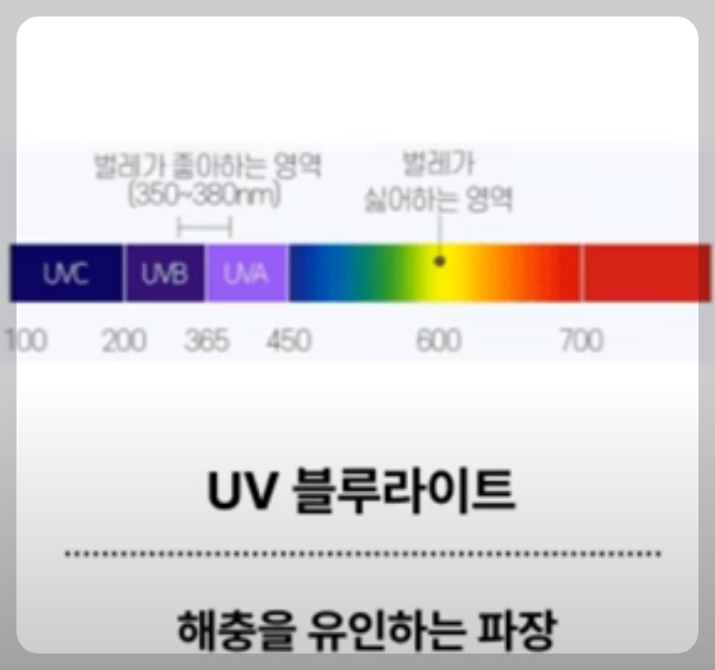 ① UV블루라이트는 모기 등 해충들이 좋아하는 파장 범위인 350~380 나노미터, 파장램프는