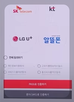 ⑱ 통신사 선택 후 전체동의체크 그리고 Pass나 문자로 인증하기 해당되는 곳 선택하세요