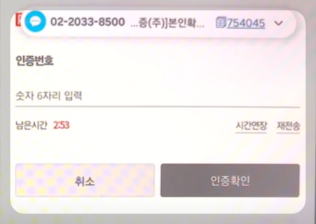 ⑳ 인증번호가 오면 인증번호 입력하고 확인을 눌러줍니다.