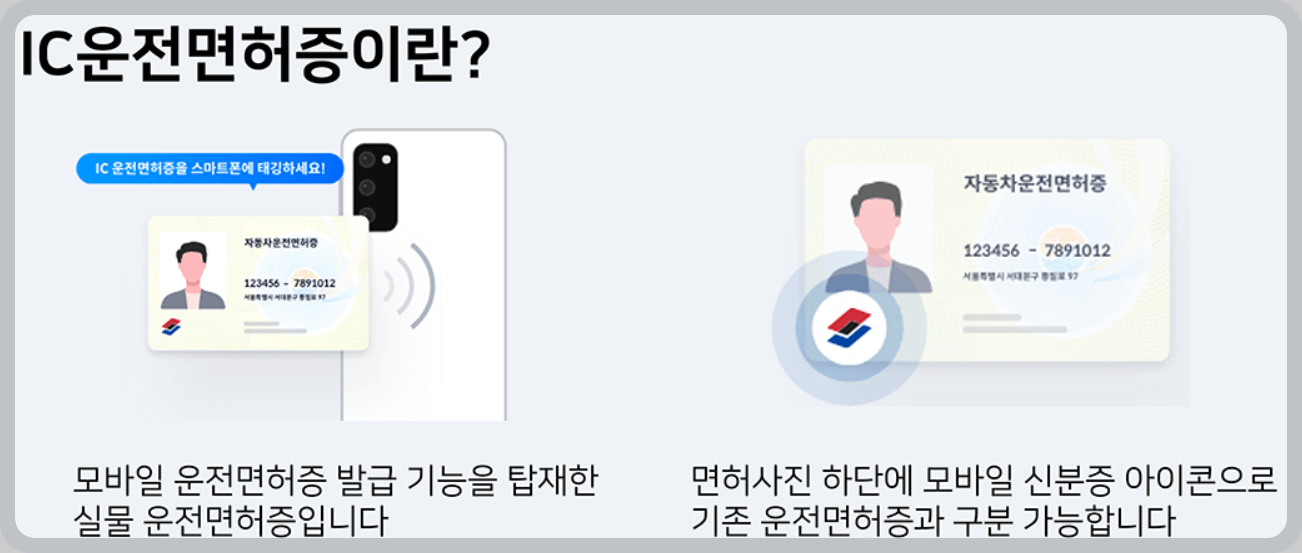 도로교통법령에 따라 7월 28일부터 모바일 운전면허증을 (IC & QR)을 발급합니다. 모바일 신분증은 개인 스마트폰에 안전하게 저장하며 편리하게 사용할 수 있다. 기존 운전면허증보다 신원증명에 혁신적으로 이용될 것이다.
