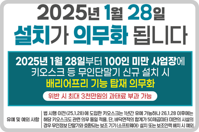 ⯄ 배리어프리 키오스크를 2025년 1월 28일부터 50 ㎡(15평) 이상 100인 미만 사업장에 키오스크를