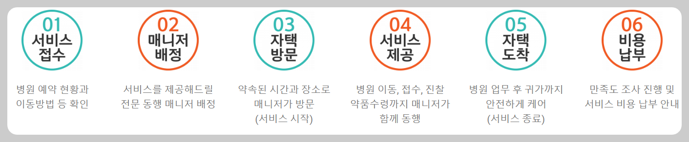 - 부양가족사정으로 도움을 받지 못할 경우에 환자를 병원으로 출발할 때부터 귀가할 때까지 전 과정을 서비스합니다