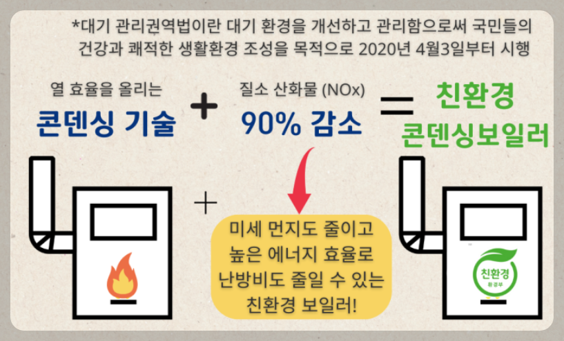 - 친환경 보일러 설치의무화는 2020년 4월 3일 자로 대기관리권역법 제35조 3항으로 친환경 보일