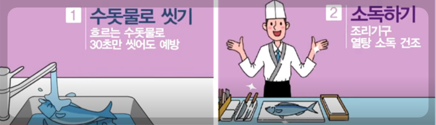- 어패류 구입 시 5도 이하의 저온으로 보관하고, 85도 이상에서 어패류를 익힙니다.