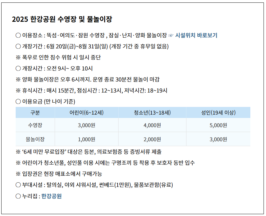 ⯄ 한강 수영장과 물놀이장 6개소는 연령대별로 즐길 수 있도록 성인풀, 청소년풀, 어린이풀, 유아풀로 나누