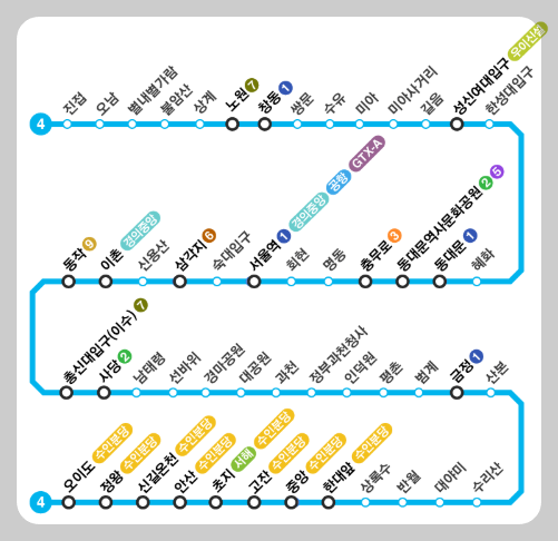서울지하철 노선도 4호선- 연계지역 안산, 진접.