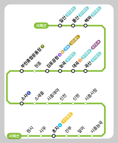 ⦁ 서해선 ↑ : 암산원시역에서 김포공항을 경유 일산 운행.