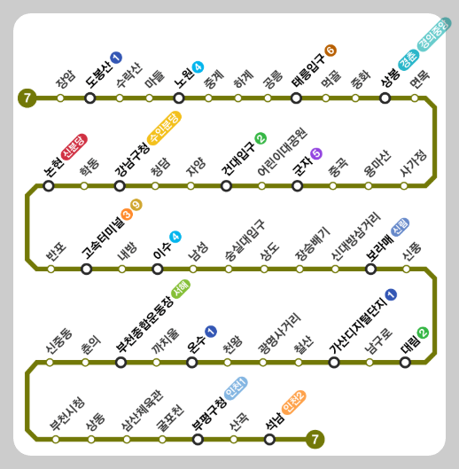 서울지하철 노선도 7호선- 연계지역 부평, 도봉산.