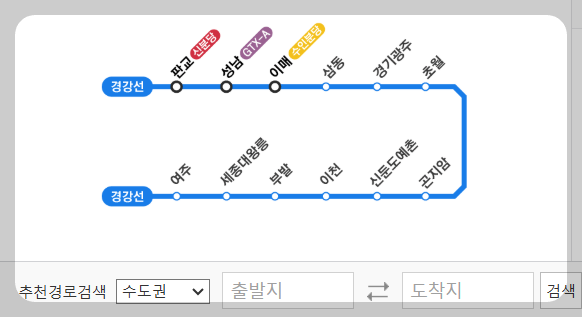 ⦁ 경강선 : 판교→성남→경기광주→이천→세종대왕릉→ 여주.