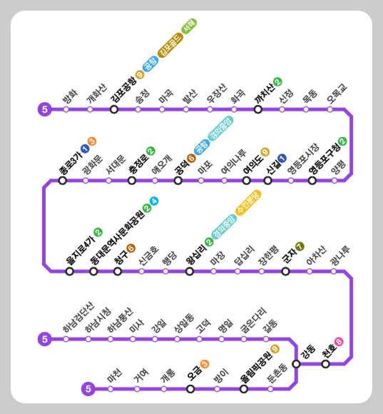 서울지하철 노선도 5호선- 연계지역 하남, 오금동, 김포공항 지역.