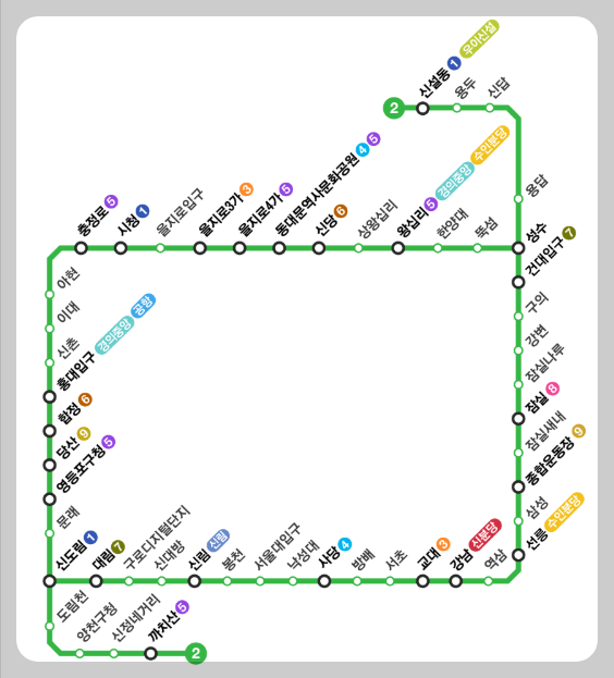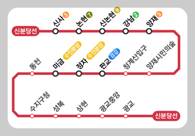 ⦁ 신분당선↑ : 신사→ 논현→강남→판교→정자→미금→수지구청→광교.