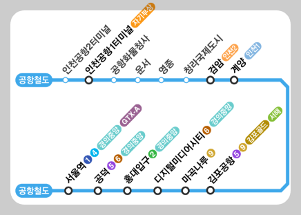 ⦁ 공항철도. ↑ : 서울역에서 인천 국제공항 제1 터미널, 제2터미널 간을 운행.