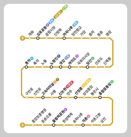 서울지하철 노선도 9호선- 연계지역 보훈병원, 김포공항 개화.