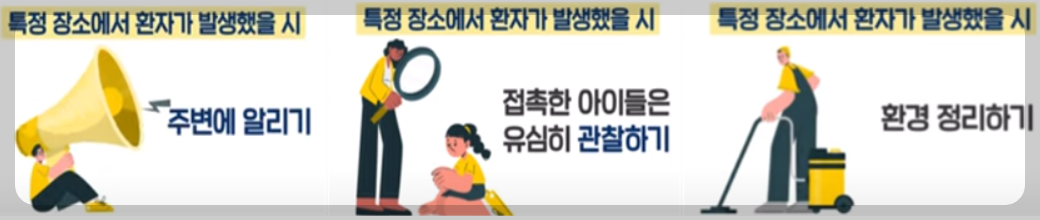- 어린이집 등 에서 환자가 발생하면 주변에 알리고 접촉한 어린이들을 관찰합니다