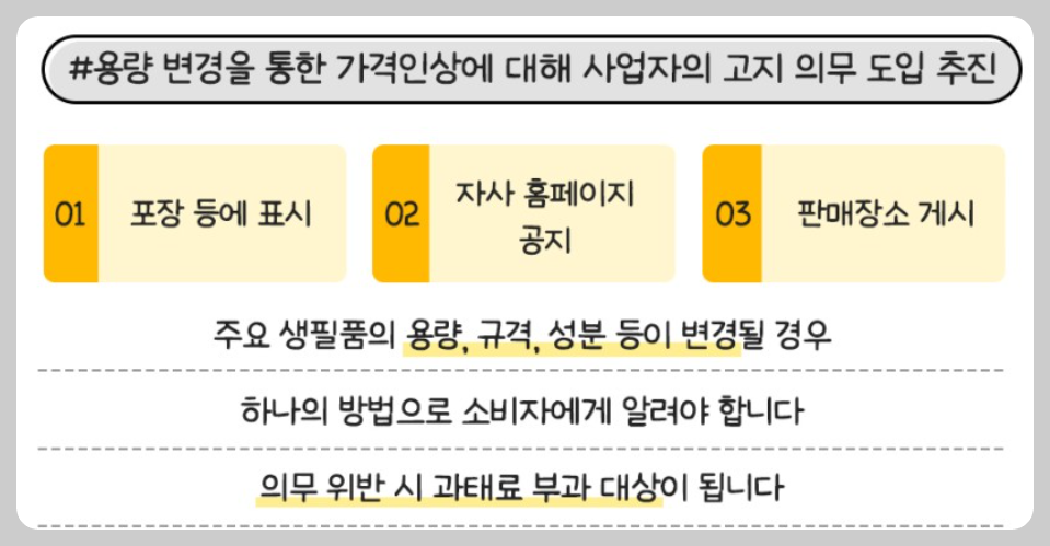 -용량 등의 변경으로 단위 가격(출고 가격 기준)이 상승하는 경우 소비자가 쉽게 인지할 수 있도록 제도를 개선합니다.