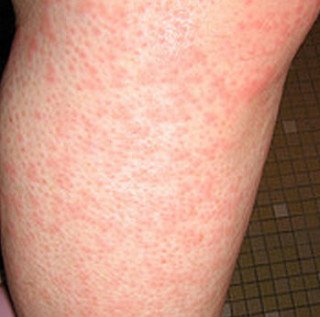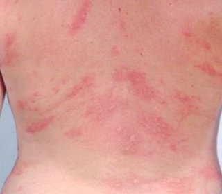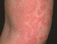 ● 피부에는 붉은색이나 피부색의 부풀어 오른 발진이 나타납니다. 피부 발진으로 붉고 부풀어 오른 팽진이