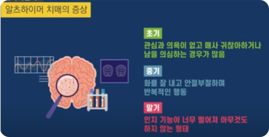 ⯄알츠하이머치매는 신경 퇴행성 뇌 질환으로 초기에 주로 기억력 저하를 호소하며 서서히 발병하