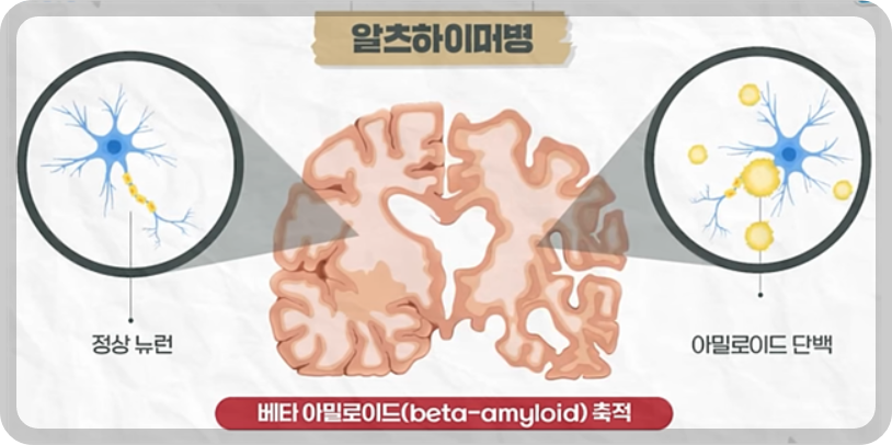 ⯄ 뇌 속에 있는 신경 세포에 베타아밀로이드가 뭉쳐서 쌓이면 신경세포가 파괴되고 뇌전반으로 확