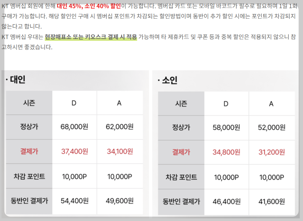 - 오후권은 14:30분 이후로는 40% 이상 할인가능합니다.