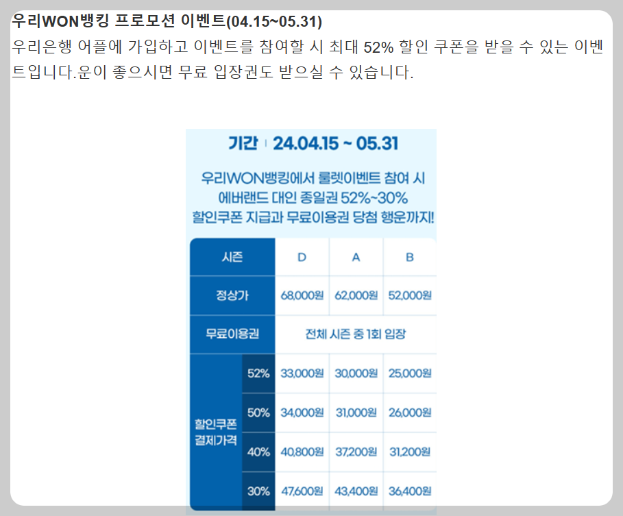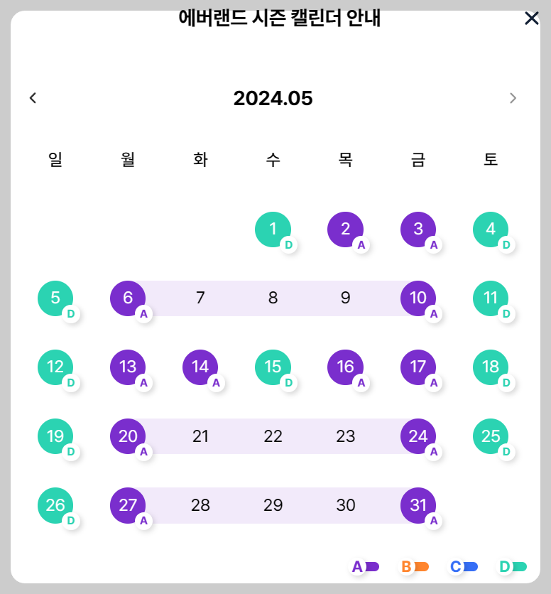 - 에버랜드는 성수기와 비성수기 맞게 ABCD로 구간을 정하여 구간별로도 가격이 다릅니다.