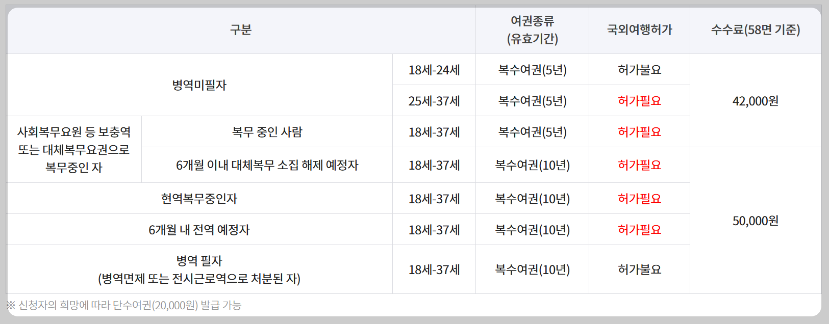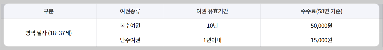 ○ 병역의무자의 발급 여권 및 수수료.