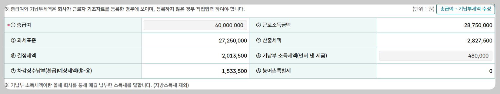 ⦁ 위 화면에 자동계산된 결정세액이 2,013,500원이고 원천징수된 금액이 480,000원입니다.