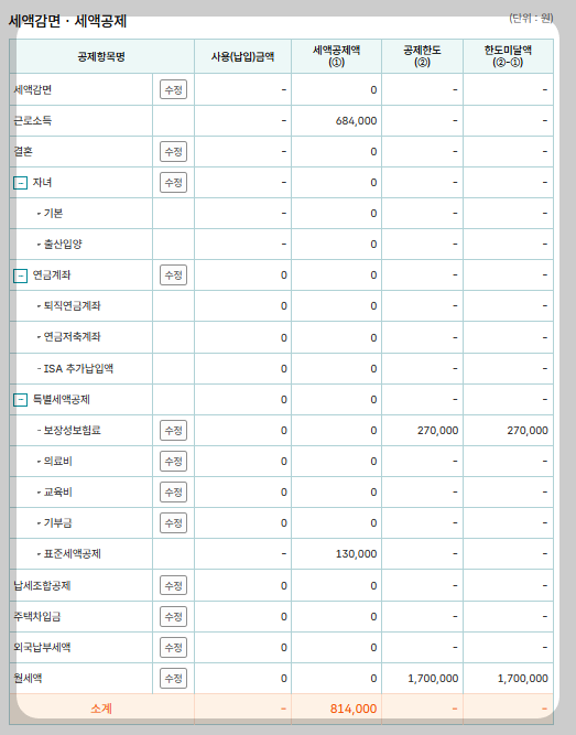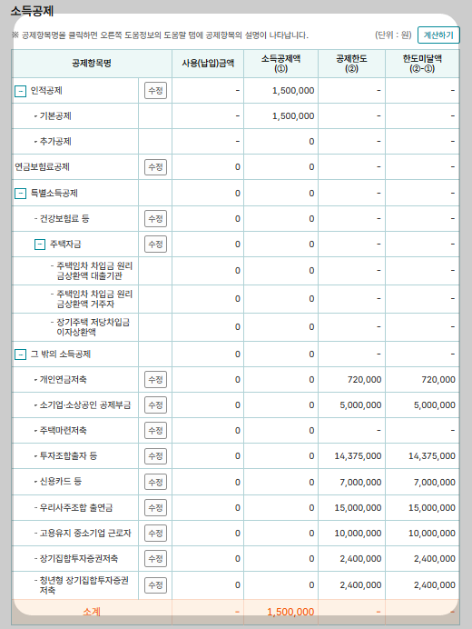 ⦁ 아래표에서 수정을 클릭을 하면 공제사항에 대한 내역을 참조하여 기입을 하면 됩니다.