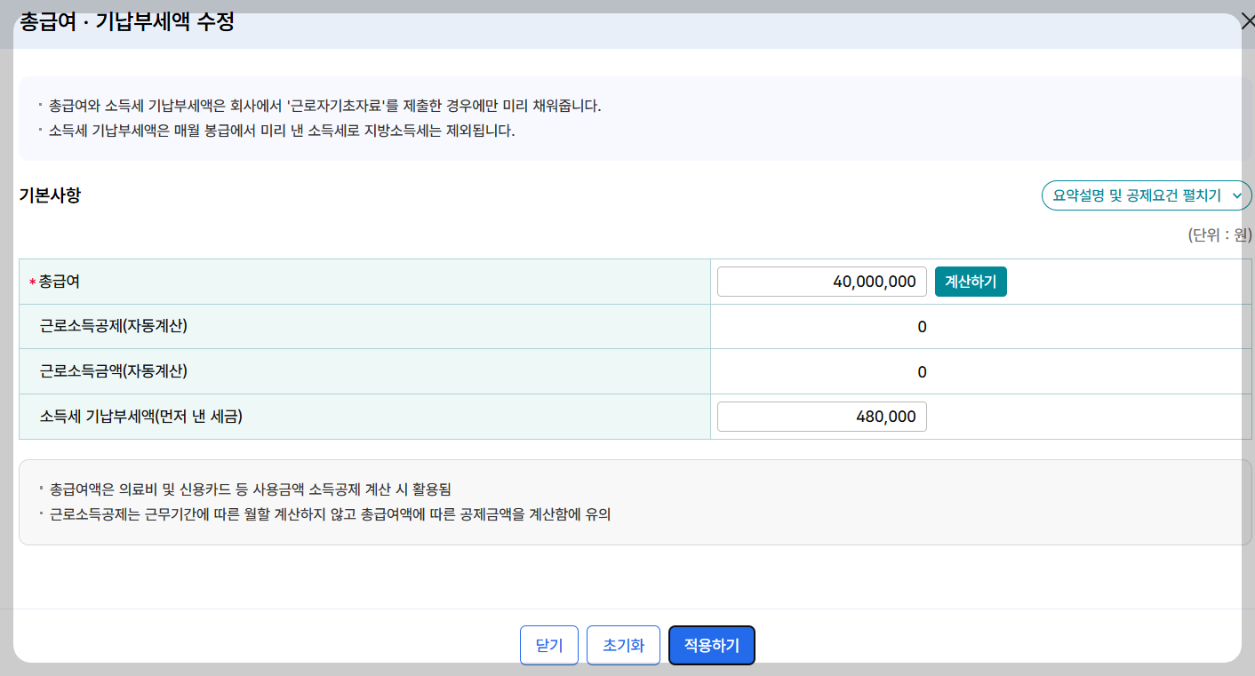 1개월 40,000원으로 12개월 원천징수 총 480,000원을 기입하고 적용클릭 하고 적용하기를 클릭