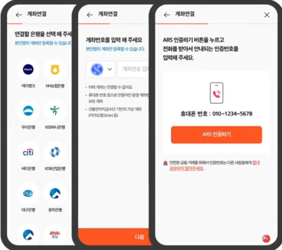 ⑤ 연결할 은행 선택 후 계좌번로 입력 후 ARS에서 안내하는 인증번호입력