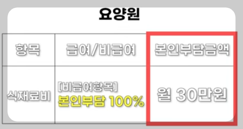 - 요양원에서는 식재료비 즉 비급여비는 100% 본인 부담금입니다.