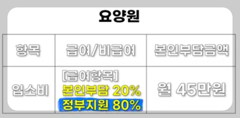 - 요양원에 입소비용은 80%가 보험 처리되고 수급자가 부담하는 식재료비의 경우 월 45만 원 정도