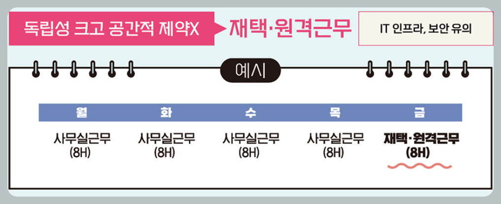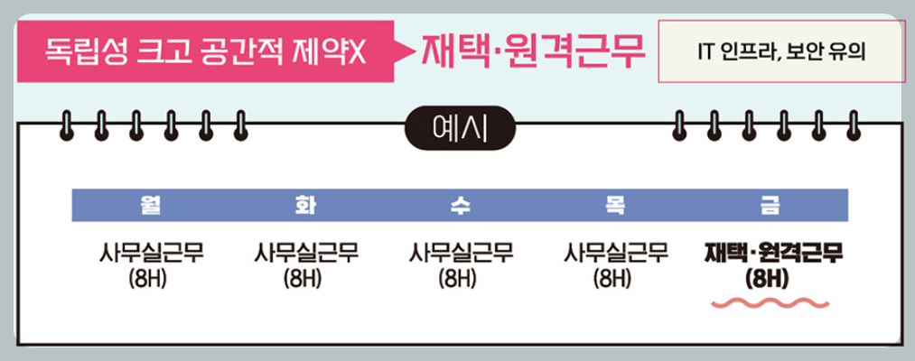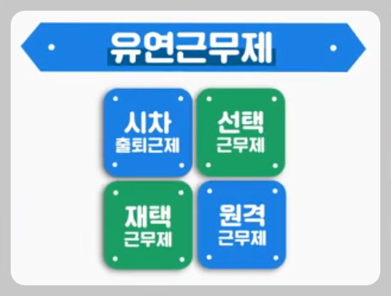 ⦁ 유연근무제는 시차 출 ㆍ퇴근제, 선택근무제, 재택근무제, 원격근무제의 네 가지 제도로 내가 원하