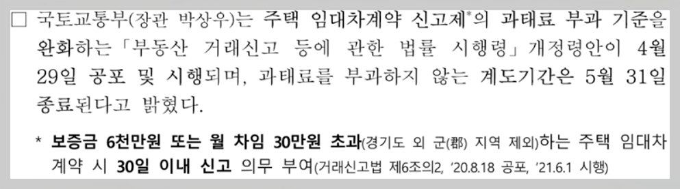 ⯄ 주택 임대차 계약 신고에 관한 개정 법령안이 시행되기 전 계도기간을 도고 있었습니다.