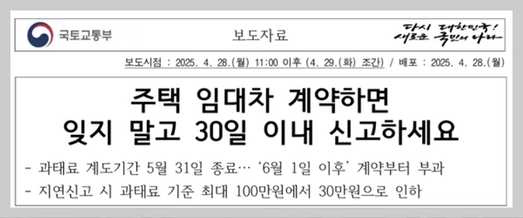 ⯄ 2025년 6월 1일 이후에 전ㆍ월세계약을 한 후 30일 이내 신고를 하지 않으면 과태료 대상입니다.