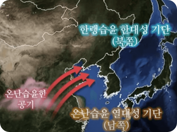 ◻ 여름철 우리나라 남쪽에서 발달하는 온난 습윤한 열대성 기단과 북쪽의 한랭습윤한 한대성